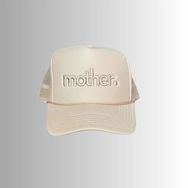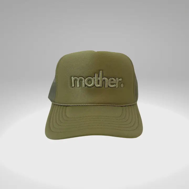 The elevated version of your everyday hat. "mother." is embroidered across our Brown + tan trucker hat with matching thread. Feel strong and empowered when wearing this hat. Features: * High profile, structured * Color: Brown + Tan * "mother." in puff embroidery * "Strong as a mother" tag inside hat * Slightly curved visor * Foam trucker with nylon mesh back * Plastic snapback