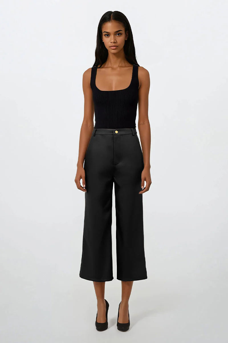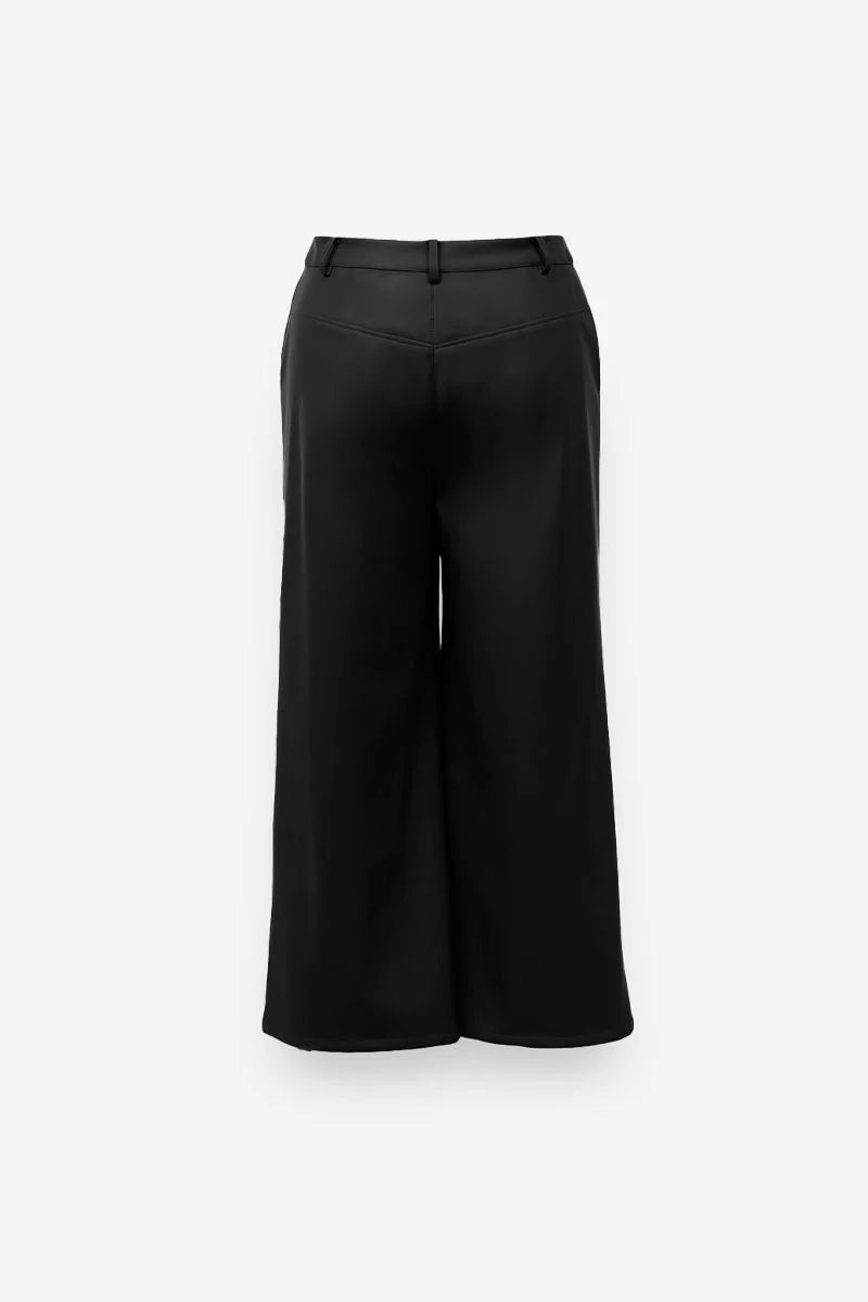 Women's Vegan Butter Leather Culotte Pants Smooth, soft-to-the-touch vegan leather with a structured culotte silhouette Gold button and zipper fly add a touch of polish