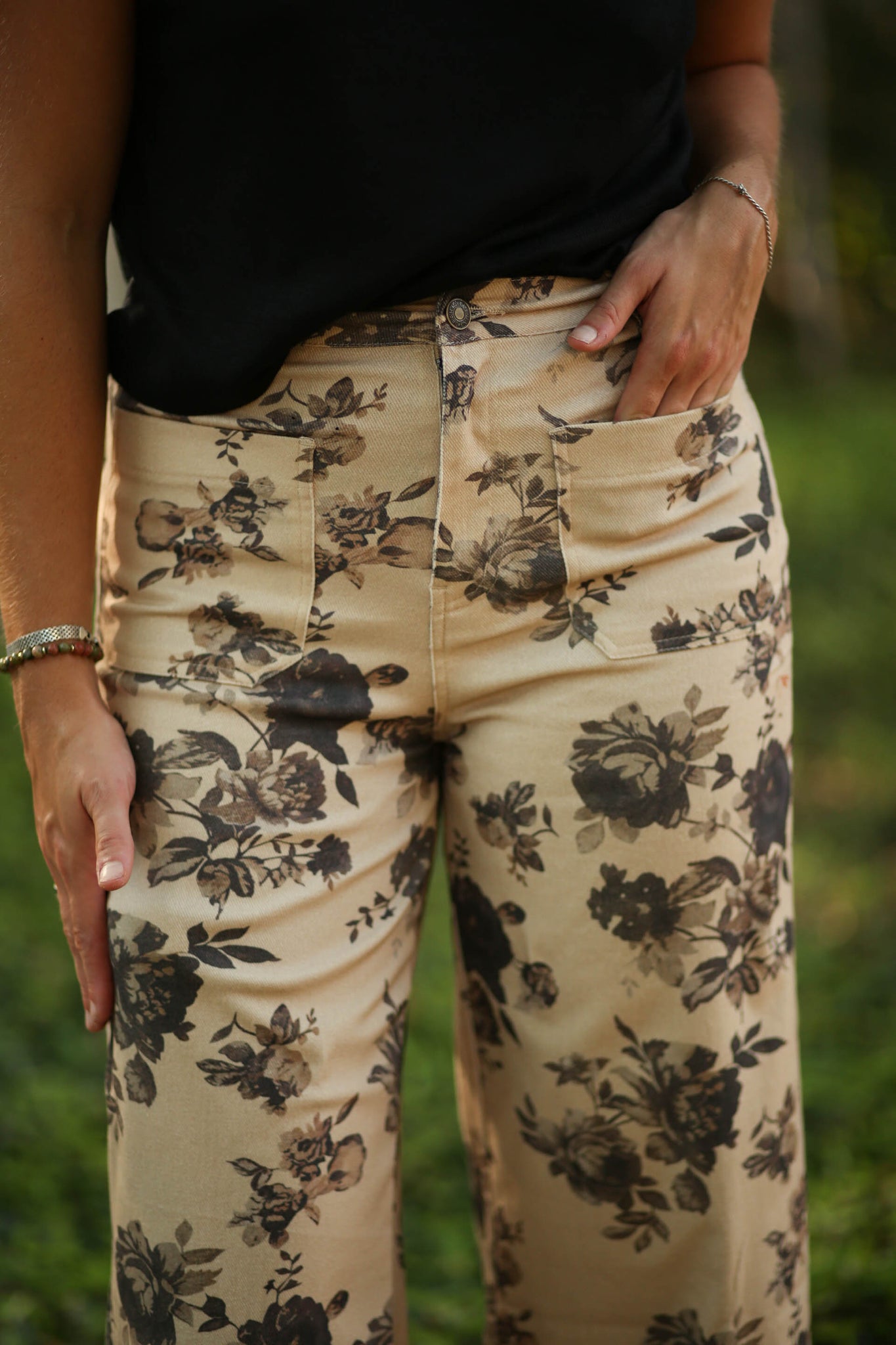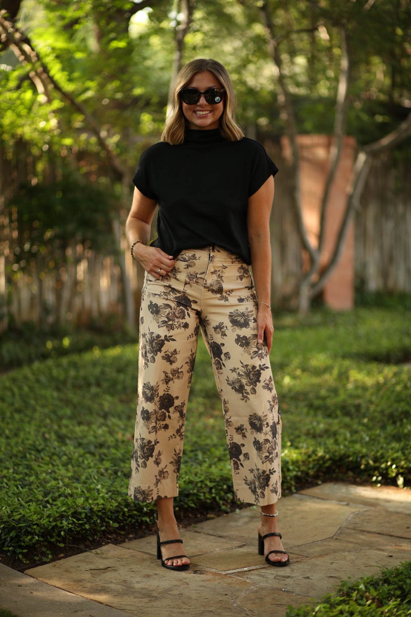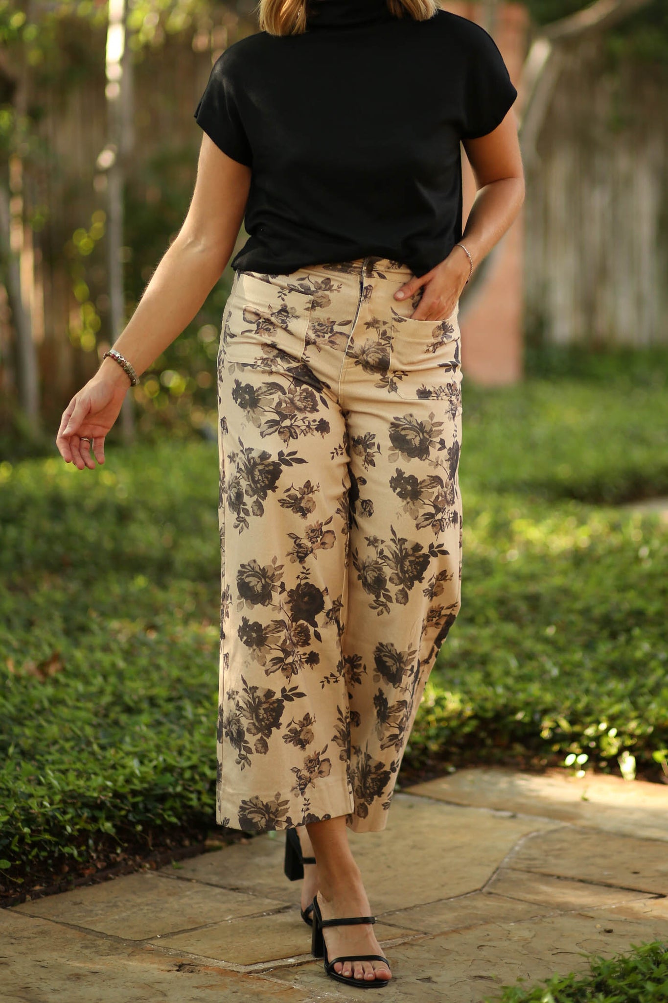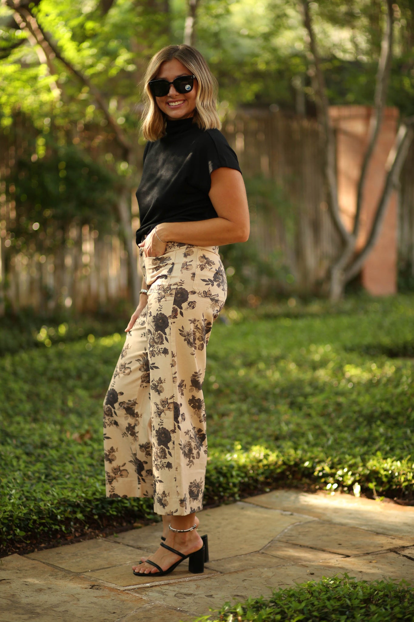 Floral pattern mid-rise ankle-length pants. Button zip-fly closure at front. Patch pockets at front and back. Unlined. Woven. Non-sheer. Lightweight.
