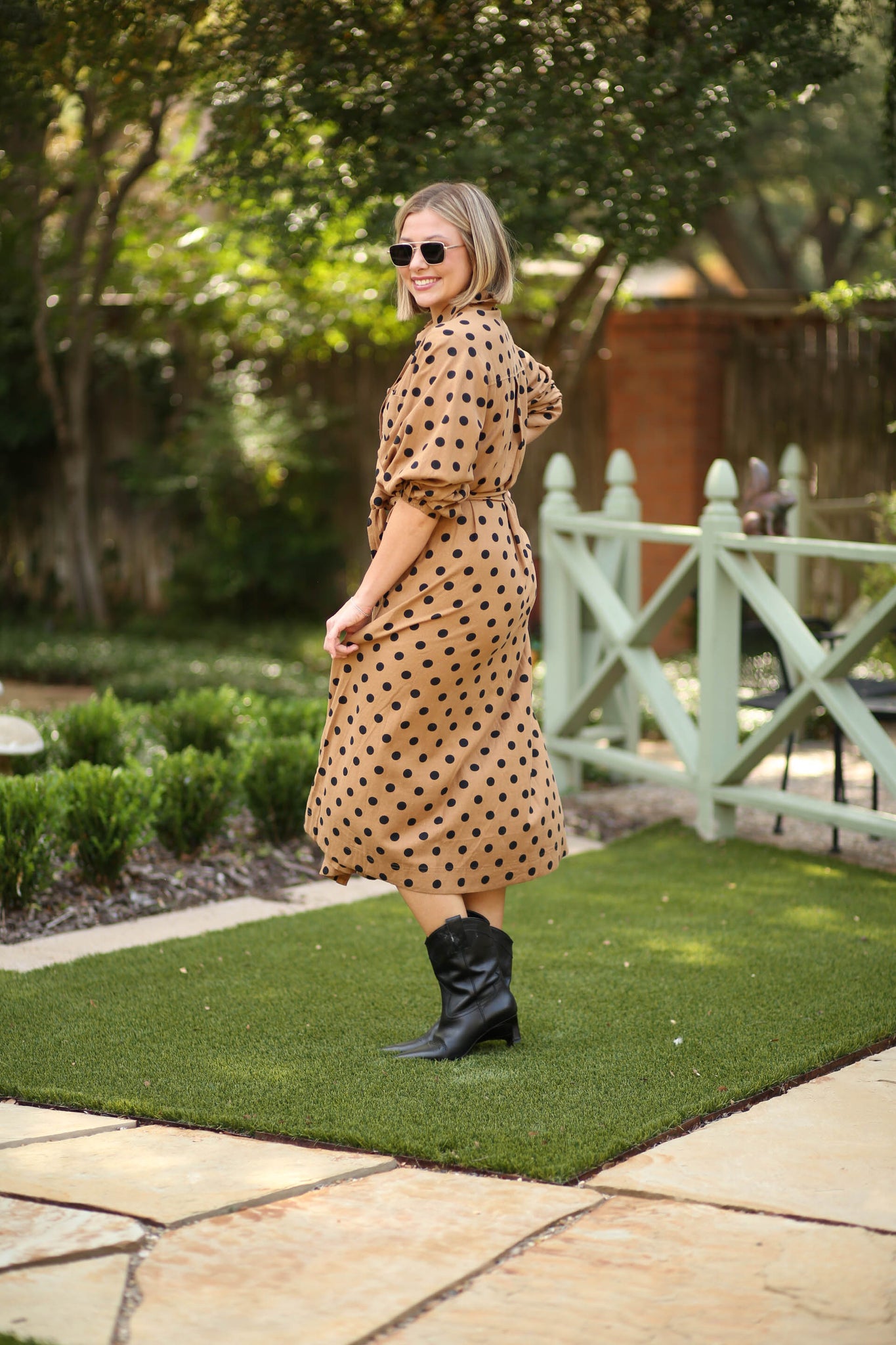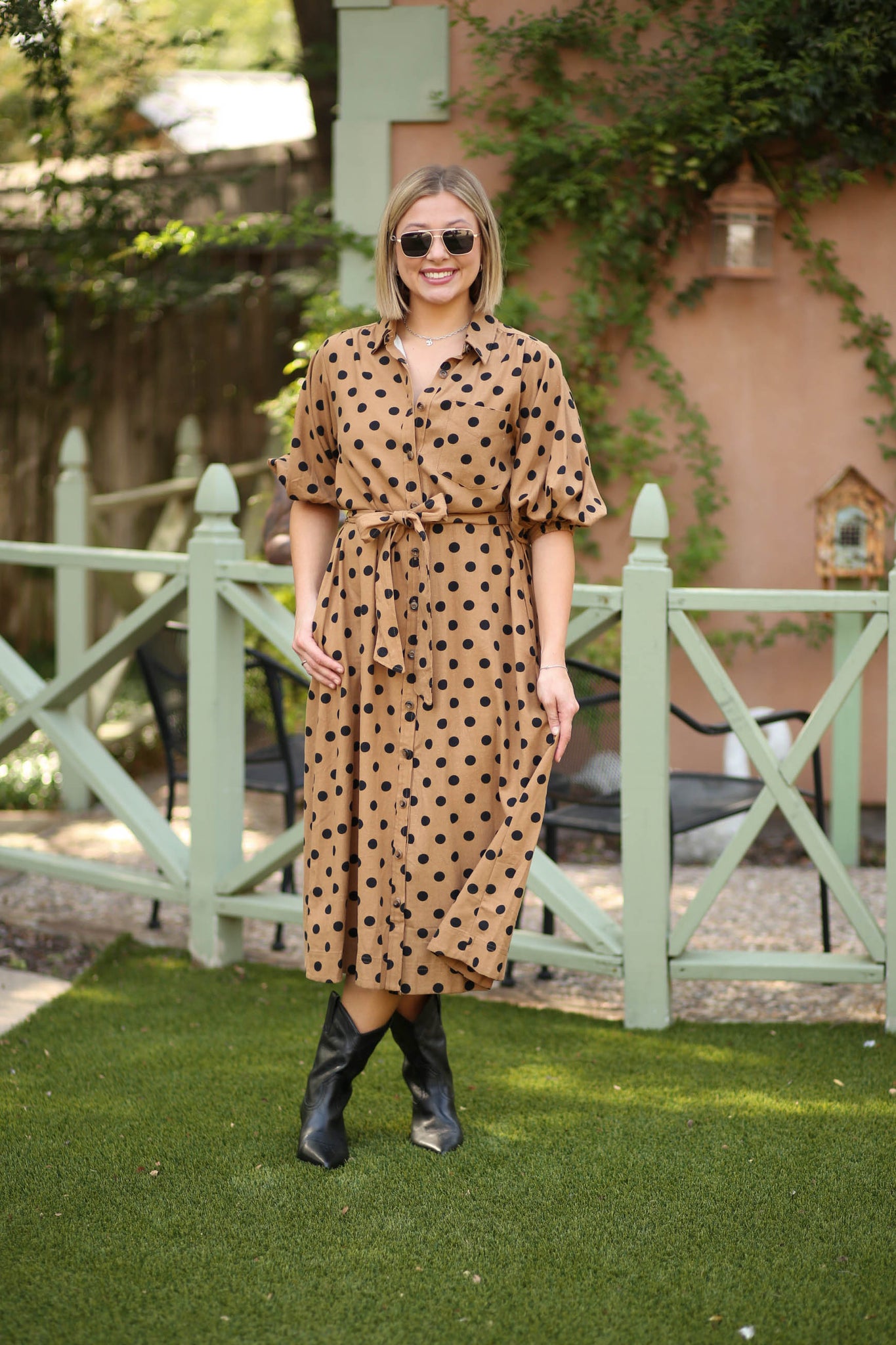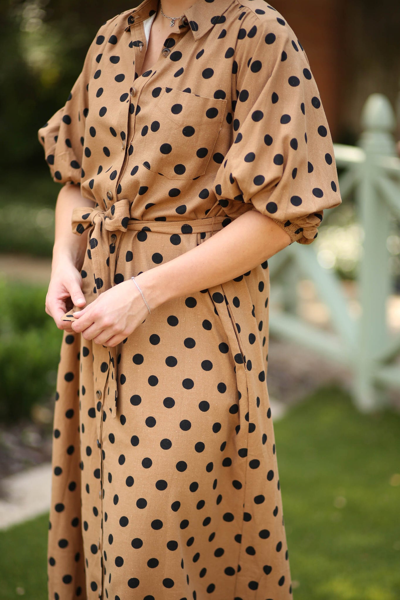 Polka Dot Longline Shirt Dress features blouson sleeve and tie waist