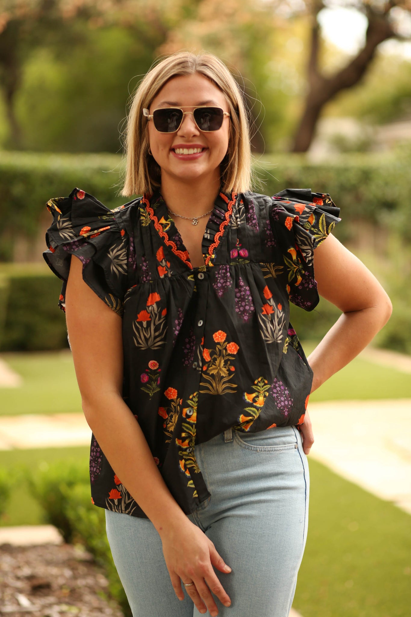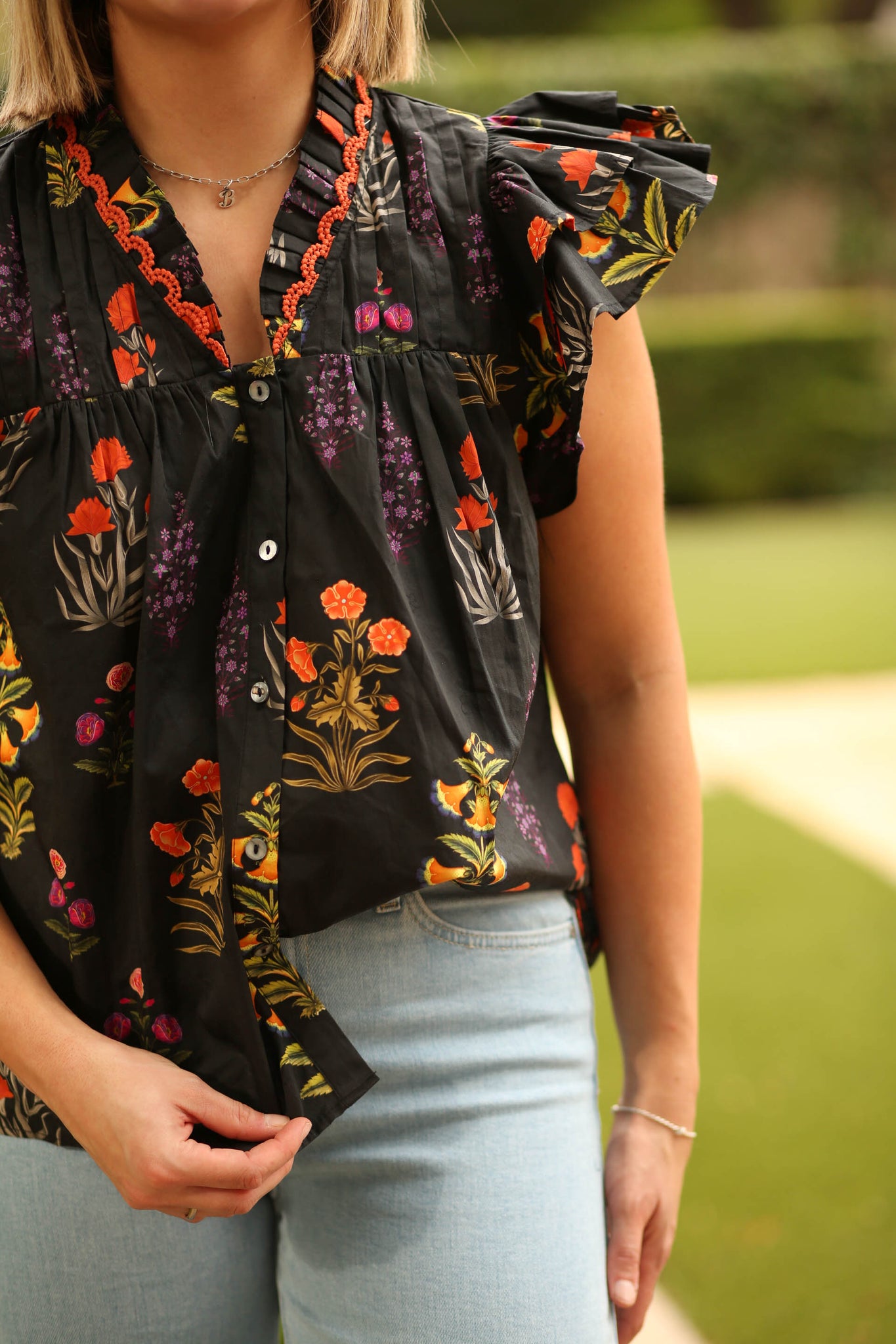 Botanical print short flutter sleeve top featuring pintuck bodice with embroidered trim V-neck. Unlined. Woven. Non-sheer. Lightweight.