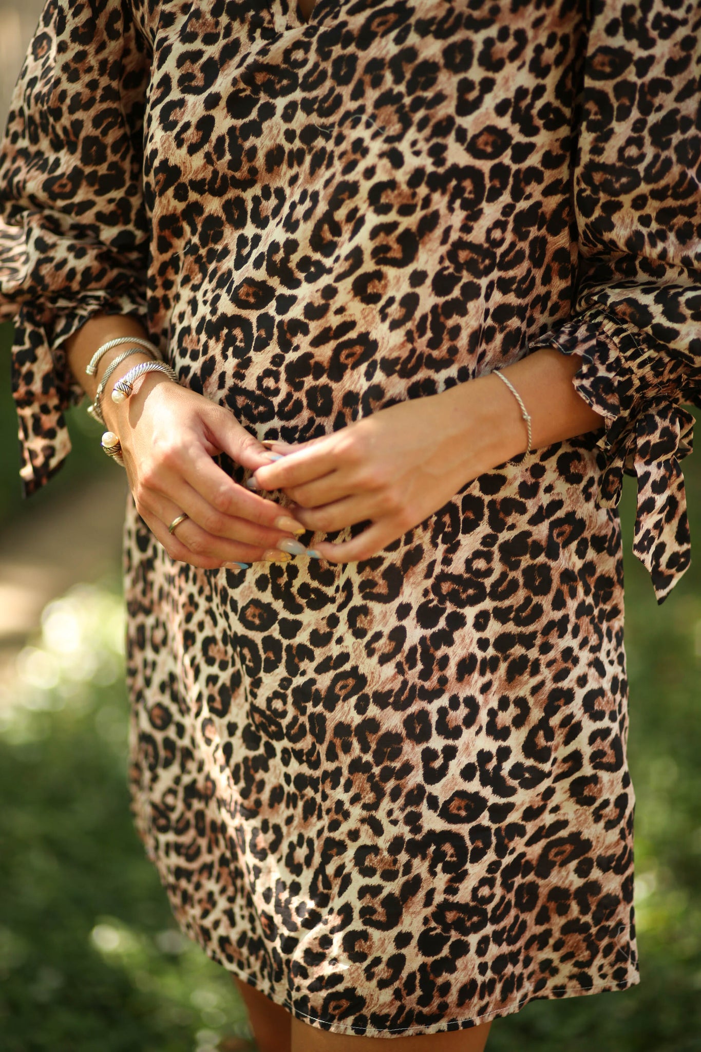 Leopard shift dress featuring puff 3/4 sleeve with bow detail