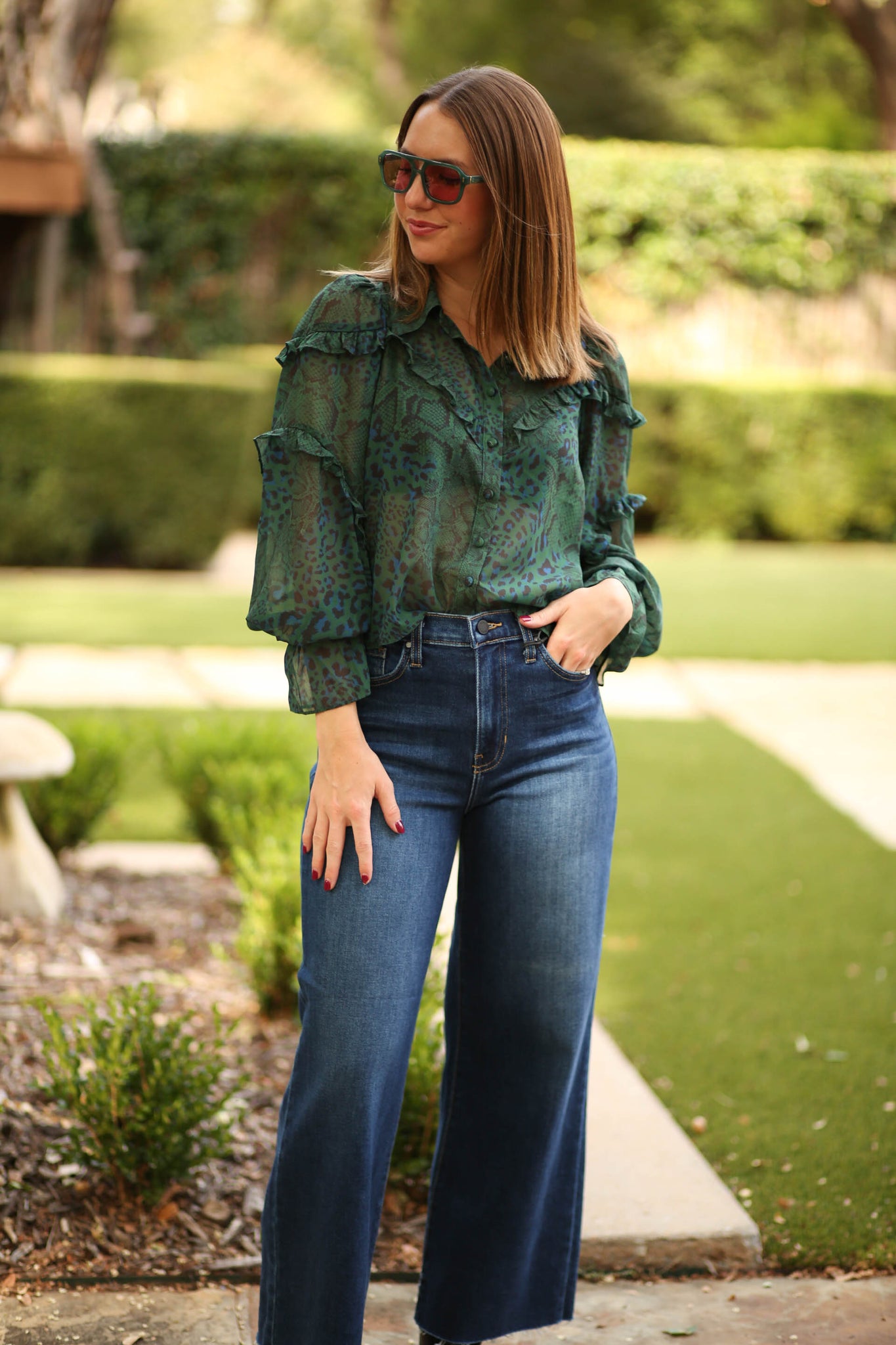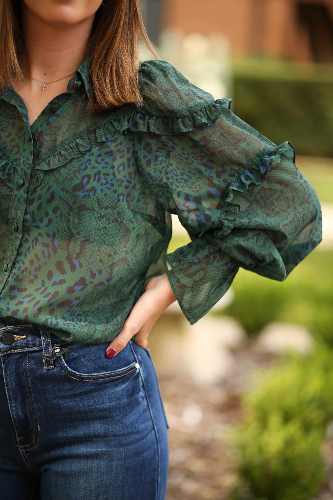 Our Zaria Green Ruffle Shirt features a ruffled hem and a button down. Sheer.