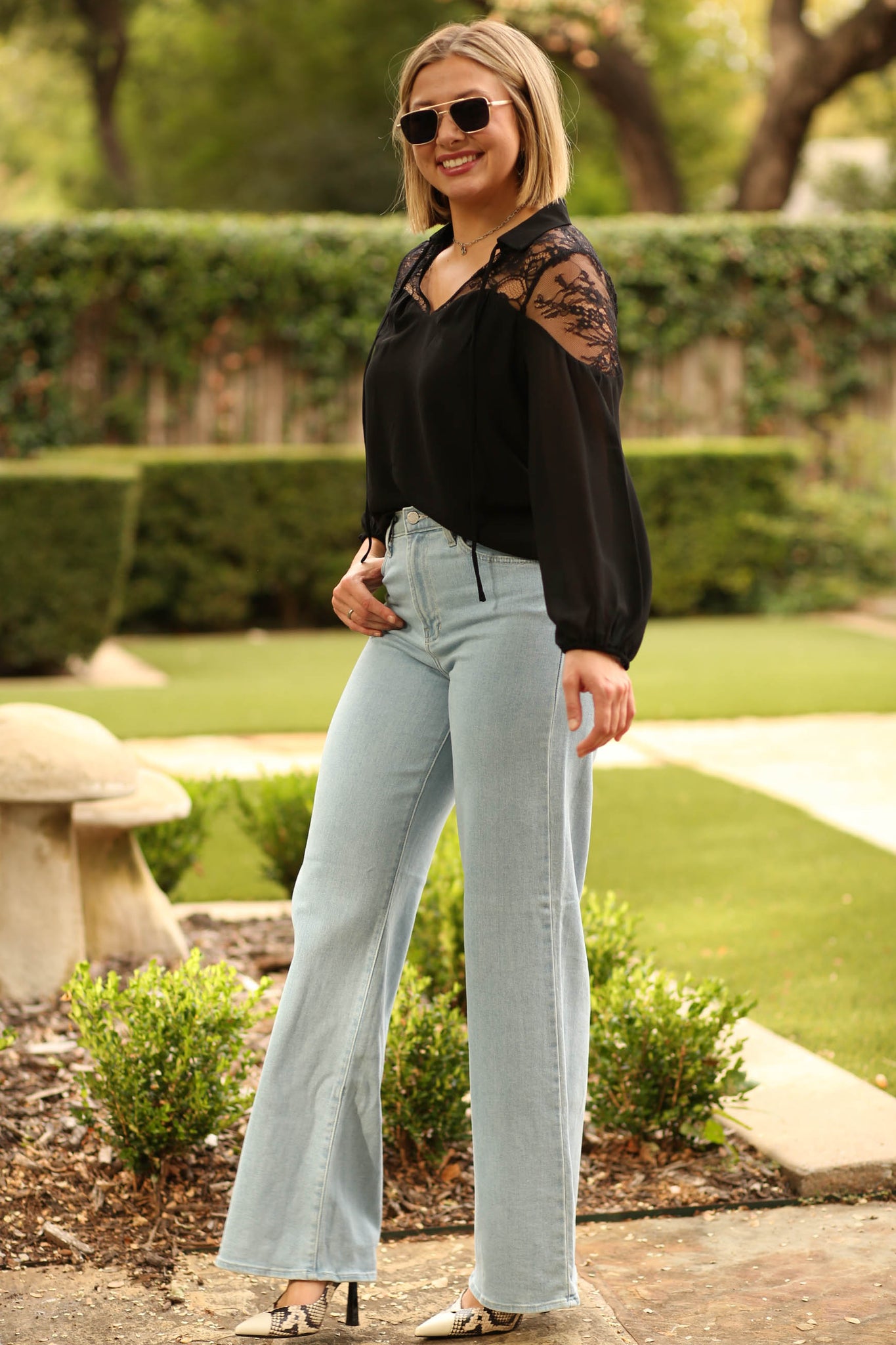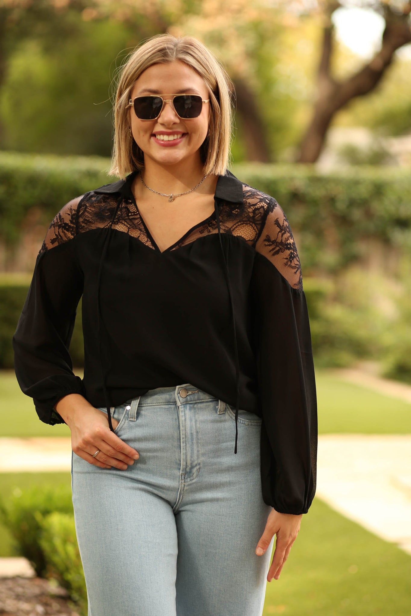 Lace yoke chiffon blouse in black